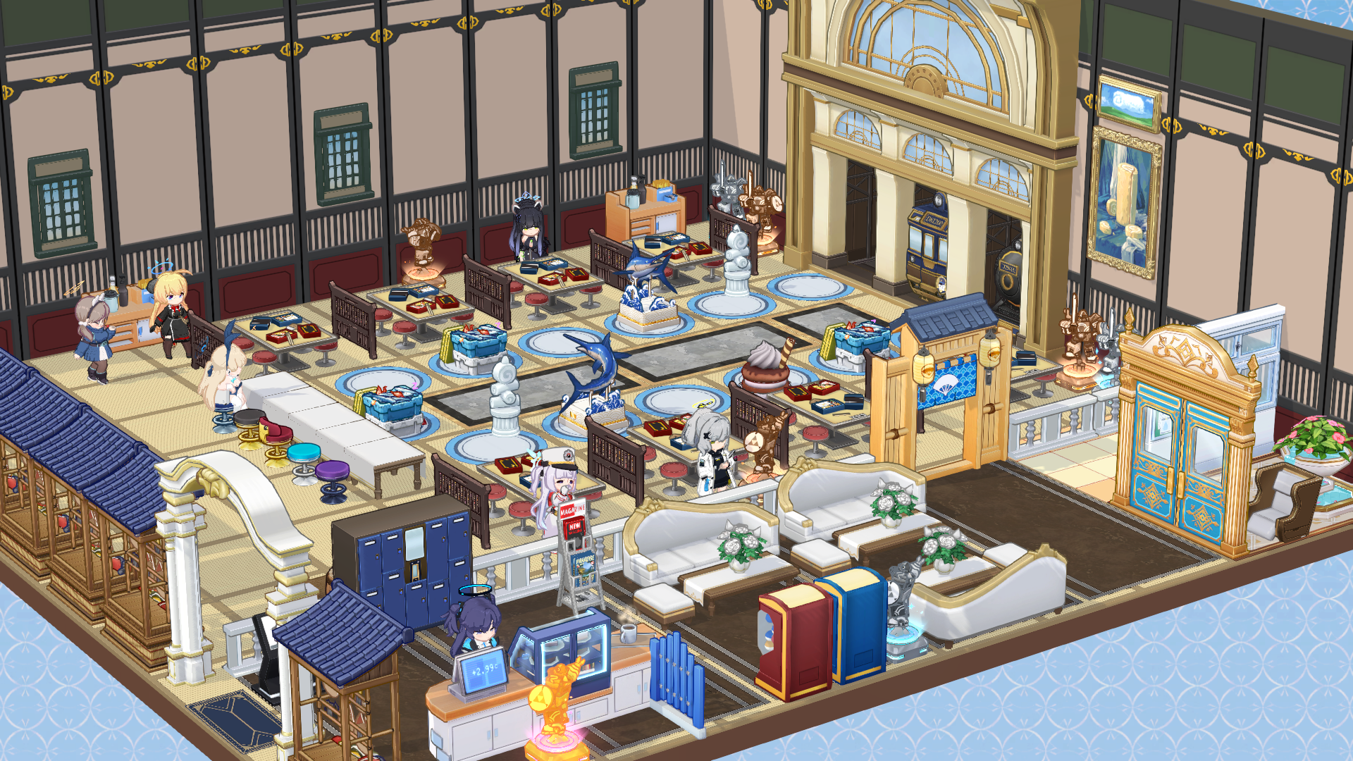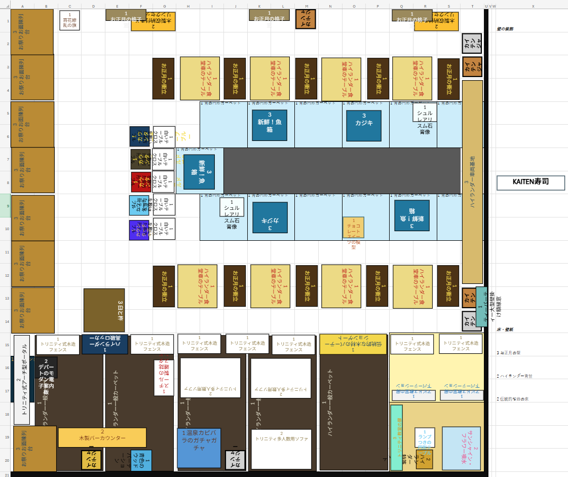 ブルアカ カフェ晒し⑮KAITEN寿司屋 雑記 2025.10.12 雑記 ブルアカカフェ 概観(クリックで拡大) http://butteraoow.hippy.jp/wp-content/uploads/2025/10/2025-09-05-20-41-23.mp4 生徒の誰かのメモロビのシーンをカフェで再現できないかと考えて、 アカリのメモロビの回転寿司屋を造ってみました。 また、回転寿司なので、カイテンジャーとも絡ませることにしました。 【ロビー】 入り口を入ると、自動案内機やテイクアウトのロッカー・会計レジ・待合席・ガチャガチャ・トイレ があります。 【客席】 “青の円形カーペット”をすし皿に見立てて回転寿司レーンを表現しています。 肝心の寿司ネタに見立てるのは“新鮮!魚箱”や“バタバタカジキの展示台”です。 捌いてもいないただの鮮魚のどこが寿司やねん、と言われそうですが、 ・ミレニアムには物質の巨大化をさせられるテクノロジーが存在する (原典:最終章/Code:BOX/正義実現委員会の終わらない夏休みの『巨大化レーザービーム』『リミット解除』カード) ・カイテンFX Mk.∞がこの店のマスコットキャラ ・アカリは桁違いの大食い ⇒これらの要素を繋ぎ合わせると、 『ここは最終章で色彩ペロロジラと戦ったカイテンFX Mk.∞くらい 寿司もサイドメニューも流れてくるネタがとにかく巨大なのが売りの店だ』という トンデモ設定が成立するのではないでしょうか。 “ハイランダー車両基地”が裏の厨房に繋がっています。 客席の“ハイランダー食堂車のテーブル”も、椅子がソファかスツールかの違いはあれど、 遠目で観ればメモロビのテーブルと似た色合いだし、 “お正月の衝立”と併せて回転寿司屋っぽさを演出してくれています。 また、通常アカリにはモーション家具が無いため、 代わりにロッカーの後ろの死角に正月アカリ用の“臼と杵”を隠してあります。 設計図 カフェ15号店の解説は以上。いかがでしたか? 次回につづく。 ブルアカカフェ紹介記事一覧 【ブルアカカフェ晒し記事一覧】 カフェ①温浴施設 カフェ②ライブハウス カフェ③宴会場 カフェ④フードコート カフェ⑤総力戦+デカグラマトン編ジオラマ カフェ⑥公園 カフェ⑦シアター カフェ⑧小児歯科 カフェ⑨カラオケボックス カフェ⑩木造駅舎 カフェ⑪焼き鳥牧園 カフェ⑫コミセン会場 カフェ⑬ねこいぬうさぎきつねカフェ カフェ⑭すごろく風ドライブコース カフェ⑮KAITEN寿司屋 カフェ⑯旅館客室(原稿合宿) カフェ⑰寺子屋 カフェ⑱ラーメン屋